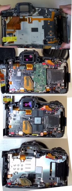 I tried normalizing some cut outs from the video, flipping the back panel to make it easier to compare. There are 2 air gaps and one PCB board between the heat conductor covering the chips in picture 3 before it gets to the back panel. I am not sure what the white and black material in the first picture is. If the white material is a soft heat pad, then it would provide fair conductivity to the PCBs and eliminate one air gap. It could also just be the magnesium chassis. The black rectangle is placed right above the hot parts, could be a thermal pad. There seems to be one copper part on the top left under the wiring. This could mean the small white chip on the top left in the second picture also generate heat. The heat conductor in picture 4 seems to only distribute the heat around the internals of the camera, which means the heat will slowly reach the chassis after heating up the internals and conducting through the air gaps. This conductor has a thermal pad to the back of the PCB with the main chips (CPU?), but I would guess that the main purpose would be to redistribute heat from the image sensor since there is a large surface facing the sensor. However, because of the IBIS there is an air gap between the sensor and this heat conductor. Everything that generates heats except for the memory card is covered by PCBs, which makes it a lot more difficult to make any improvements. The easiest and maybe most promising DIY improvement would be to cover the parts with electrical insulating thermal paste. Silicon thermal paste is much worse than metal thermal paste from a thermal perspective, but should be safe to add anywhere as long as it doesn't get near the IBIS. It would make it a mess if you ever need to have the camera repaired. -
