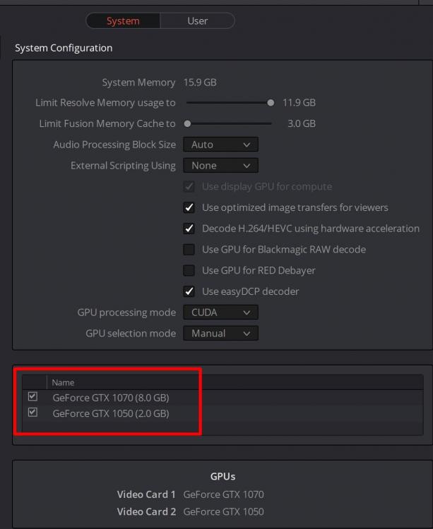 Updated Nvidia and TB drivers, and here is my screenshot from Resolve attached, noup that doesnt help I can disable 1050 and it doesnt effect anything, same as "Auto", only if I choose 1050 manually and disable 1070 completely (or just pull out the plug from it) it works. Didn't find any "use display GPU for compute" box though So Resolve does use my 1070 and does see it perfectly it just doesn't work as it should. Thats the bummer. Now the interesting thing - I did test the GPU usage and my 1070 shows 70-80% usage when I try to play a simple 4k24p clip in resolve. Which it cannot play smoothly anyway. Now when I playback a 4k60p file in windows directly, I get around 40-50% GPU usage from my 1070. And when I try to playback 4k24p file in Resolve with 1050 only it shows 13% GPU usage for 1050 and 70% usage for Intel HD 630 which I though doesnt participate in any kind of decoding in Resolve at all. Very wired. For 4k60p in Resolve 1050 gets around 30% usage, CPU spikes to 90-100% and intel HD 630 is still around 70% and the fps is around 45fps. In windows if I use CUDA player to play video my 1050 can actually handle 4k60p with no problem getting around 35% load and 22% CPU with 60% HD630 load. Wow. I previously was using HD630 trying to play it and it could not, but 1050 does it with only 35 load. So how my 1070 gets 50% load at the same task? Haha)