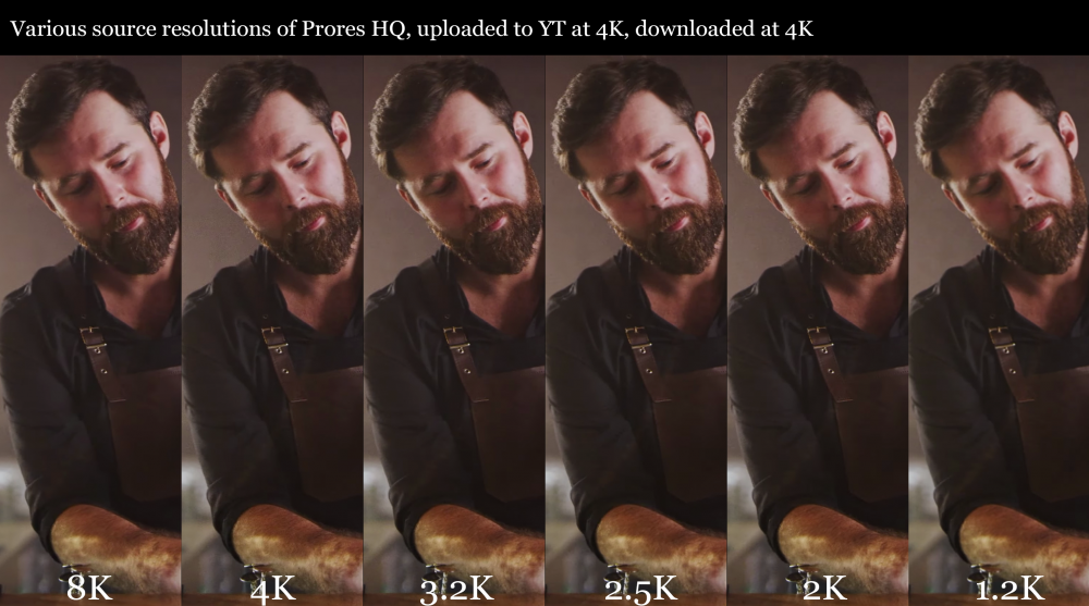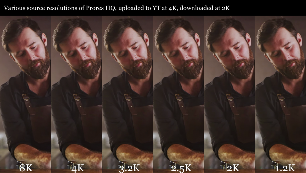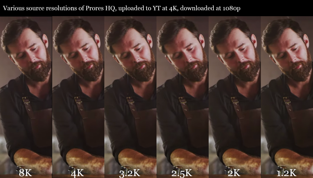 So, with all this talk about 8k RAW, it's got me thinking, and I'm contemplating going back to 1080p. I've been thinking about all these cameras with high resolutions and ferocious data rates, and why they don't implement higher bitrates and bit-depths on the lower resolution modes. Noam Kroll just shot a low budget feature in 2K Prores HQ on his Alexa Classic. In 4:3 no less! https://noamkroll.com/playing-against-filmmaking-trends-on-our-feature-with-arri-alexa-classic-2k-prores-hq-43-aspect-ratio/ His pipeline was RAW -> Prores HQ -> storage. Prores HQ in 1080 is around 176Mbps, is All-I, and is 10-bit. It sounds lovely. Uncompressed 1080 10-bit is a whopping 1490Mbps, so the 176Mbps of HQ is quite a saving of data rates. But what do I actually want? So I made a list: I want more bit-depth than 10-bit 10-bit is fine if you're on a controlled set or have time to get your WB broadly right in camera, but for some of the horrendous situations I find myself in, having more bit-depth would help (remember how with RAW you can WB in post - well, bit depth is what enables that) I want high bit-rates for a good quality image A good quality image means that every portion of the screen gets a decent amount of data, so this is about bit-rate. It's not about resolution, because a 100Mbps 4K file will still have half the data available for each square cm of the screen than a 200Mbps 1080 file I want files that are easy to edit in post It doesn't matter if my 8K smartphone files are only 100Mbps, the computer still has to decode, process, display, and encode 16 times as many pixels as 1080 So, do I want 1080p RAW? Yes, and no. RAW has great bit-depth, much larger bit-rates than I care for, but also isn't the best that 1080 can get because it is lower resolution after debayering. Do I want 2.5K RAW? Maybe. Problem is that RAW and IBIS are very rarely found together. What I really want is some kind of compressed, but not too compressed, intermediary file. What I really want is 1080 Prores 4444 (which is 264Mbps) or Prores 4444 XQ (which is 396Mbps), because these are 12-bit. 12-bit would do me very nicely. So, what do we get from the manufacturers? We get ridiculous bitrates on the higher resolutions, and paltry token efforts on the lower ones. My XC10 is a classic case - 305Mbps 4K but 35Mbps 1080p. The 4K has 2.5 times the amount of data per pixel than the 1080p, and 10 times the amount of data per square cm of screen. But I have a GH5, which is one of the exceptions, as Panasonic went for the jugular on the lower resolution modes as well as the higher ones, and so I'm down to the three "best" modes that will work on a UHS-I SD card: 5K 4:3 200Mbps Long-GOP h265 4K 16:9 150Mbps Long-GOP h264 1080p 16:9 200Mbps All-I h264 So I shot a test. That test showed me that the 5K mode is far superior, even on a 1080p timeline, but uploaded to YT is a different story. Considering I have partnered with YT for distribution share my videos on YT, that's what my friends and family end up seeing. This lead me to the question about what is actually visible after it's been minced by YT? Luckily I had done a previous test where I took an 8K RAW file, and rendered out various resolution Prores HQ intermediaries, then exported each of them from a 4K timeline. That video is here: So, I downloaded the above video in 4K, 2K, and 1080p resolutions, took screen grabs, and put them side-by-side for comparison. Here they are - you're welcome. So, what can I see in these images? The 4K download is better than the 2K, which is better than the 1080p. This is hardly news, each of these is more than double the bit-rate of the next one and they're all using the same compression algorithm, that's how mathematics works. Watching in 4K each lower resolution is subtly worse than the previous, except for 1.2k (720p) which is way worse. That's to be expected, 2k - 1.2k is a bigger percentage drop than the other resolutions. However, things don't get "bad" until in the 2.5k - 1.2k range, depending on your tolerance for IQ. Moving to the other extreme, watching in 1080 they are all very similar, except for the 1.2k version, which is interesting. Some of these grabs also have a lower resolution one looking better than the higher one next to it. That's not an accident on my part (I checked), it really is like that. As the original video has the resolutions all in sequence in the one video, I suspect that the frame I chose was differing distances from the previous keyframe in the stream, so that will introduce some variation. So, what does this mean? Well, firstly, no point shooting in 8K RAW if your viewers are watching in 1080p on YT. I doubt that's news to anyone, but maybe it is to some R5 pre-orders lol. More importantly, if your audience is watching in 1080 then they're not going to notice if you used 2K intermediaries or 3.2k ones. How can we apply this to our situations? This is more complex. In this pipeline we had 8K RAW -> X Prores -> timeline. This meant that the Prores was by far the weakest link, and Prores HQ is pretty high-bitrate compared to most consumer formats. 1080 Prores HQ is 176Mbps, but UHD Prores HQ is 707Mbps. I don't know of any cameras that shoot h264 in anything even approaching those data rates for those resolutions, so good luck with that. If you're shooting 4K 100Mbps h264 then that's the same bitrate per square pixel of screen as 1.4K Prores HQ, which is pretty darn close to that 1.2k that looks awful in all the above. Obviously if your viewers are watching in 4K then it's worth shooting in the highest bit-rate you can find. What does this mean for me? Not sure yet, I need to do more tests on the GH5 modes, and I need to think more about things like tracking and stabilisation which can use extra resolution in the edit. But I won't rule out going back to 1080p.