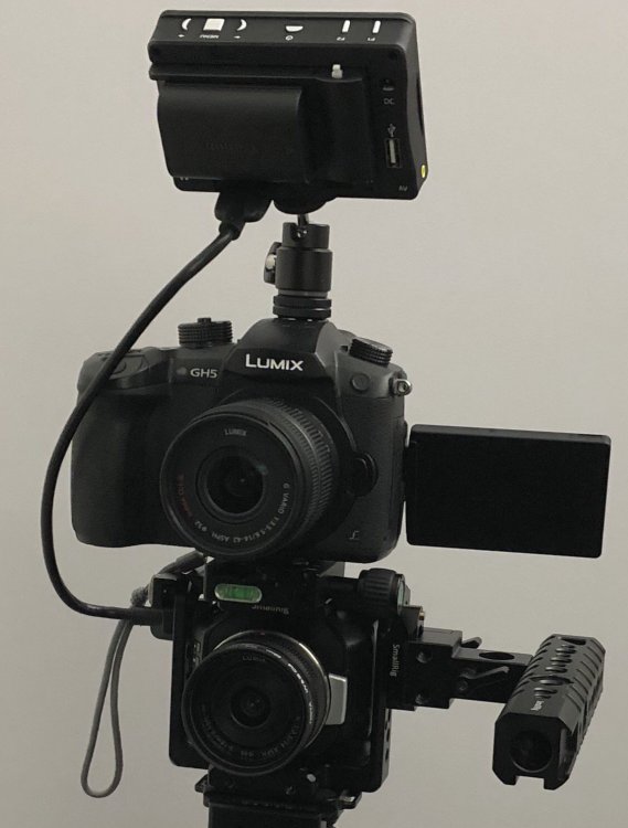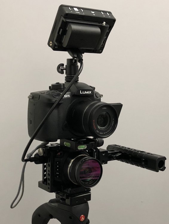 Last night I confirmed that the Panasonic 14mm f2.5 and the Panasonic 14-42mm kit lens are very similar in colour, so are close enough to be considered identical, which means I can shoot with both the GH5 and the Micro at the same time. This is really important as it means that I can shoot clips for comparison in rapidly changing lighting, instead of having a gap where I have to move the lens between cameras and the light might change during that delay. In order to accomplish this, I've just spent / wasted about an hour finding a rig that allows both cameras to be usable at the same time, where I can access everything on both, and can be tripod mounted or hand-held.. Behold the ugliness! I've also worked out a bunch of lens combinations that will have the same FOV where the "good" lens is sometimes on the GH5 and sometimes on the Micro. My plan is that once I've matched the colour and resolution we can get to testing mojo, and for that I want to be able to eliminate the factor of the lens, and I'll also be doing some blind (and anonymous) tests to see which people prefer, so having a rig that I can shoot with easily will be critical. As such, I had to work out all the combinations of lens filter thread sizes and making sure that every lens on both could get a variable ND and the Micro would always have the IR /UV cut filter too, so all those are now ordered. That was another hour of my life I'll never get back! I've also been thinking about what Juan said and I think I've wrapped my head around it and now have a plan.... 😈😈😈