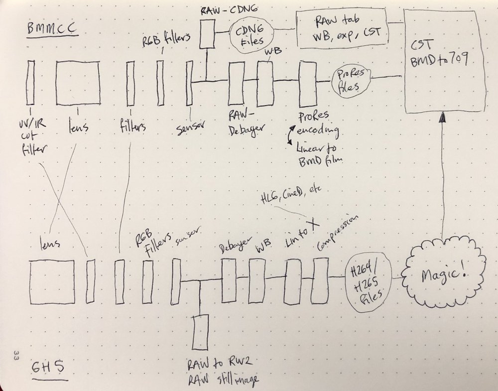 I'm now more confused. I think this is the system we're dealing with: The challenge is that on the Micro I am shooting RAW and so the only colour variable is the RGB filters on the sensor, but with the GH5 the variables are (something like) the RGB filters on the sensor, the WB setting, and then the colour profile, which is likely to be a 3D LUT with all sorts of unknowns in there. A realisation that's useful is that I can take a RAW still image on the GH5 and that should allow me to do a straight 3x3 adjustment in Linear to match them, without having to worry about the WB and 3D LUT that's on the video files. I should also be able to lock the GH5 down on a tripod and take a series of RAW images and video files and then I can try and use the RAW image as a reference to isolate the WB+3DLUT away from the RGB filters on the sensor, although this doesn't seem to help that much as the 3D LUT is where all the nasties are. I suspect that: the RGB filter adjustment is a 3x3 RGB mixer adjustment in Linear the WB adjustment is an adjustment of the levels of RGB in Linear and that the 3D LUT is all sorts of wonkiness I've also worked out that I can use my monitor as a high DR and high saturation test-chart generator. It won't be calibrated, but it shouldn't matter because the entire idea of this conversion is that any light that goes into either camera should result in (broadly) the same values after my conversion, so absolute calibration shouldn't matter. I've also realised that this is a mixture of black-box reverse-engineering where there are a few black-boxes and we can take guesses about how each is likely to work. Of course, Resolve isn't a black-box reverse-engineering tool, and it's very difficult to get pixel-perfect comparison images between the two cameras so that's kind of what makes it a challenge. I'm wondering if I should be converting things in reverse order, peeling the onion at it were, so doing the opposite of the 3D LUT, then the WB, then the RGB filter. I've also realised that I should switch to Cine-D profile instead of HLG, because although it gives a slight reduction in DR, it will enable the conversion to work on >30p footage too.