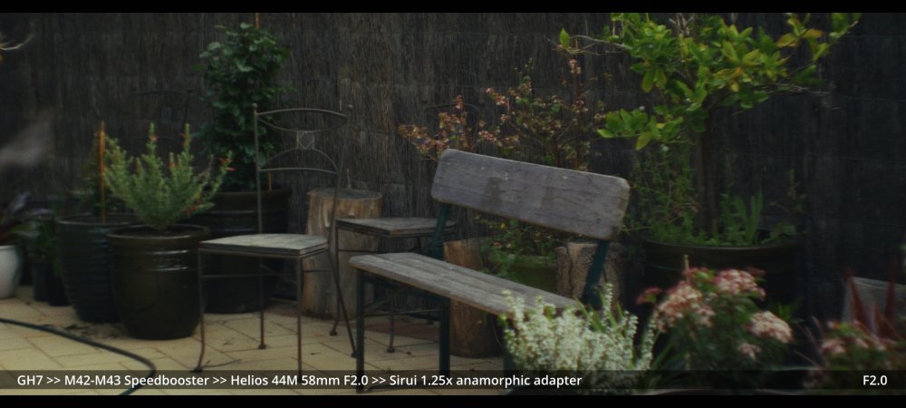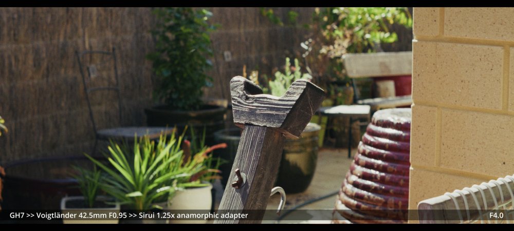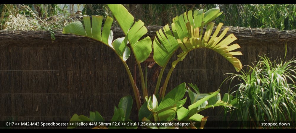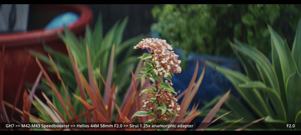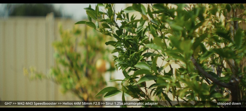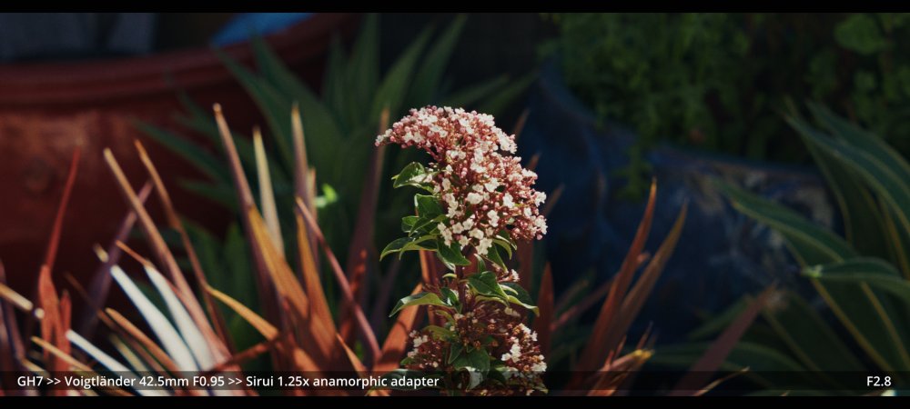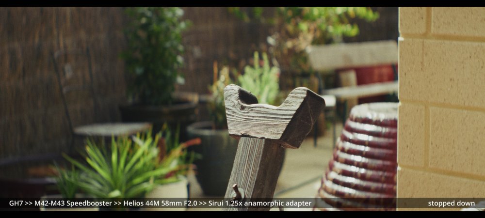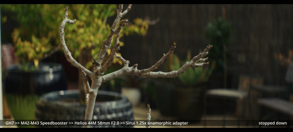 Today I tested the Voigtlander 42.5mm and Helios 58mm F2.0 lenses with the Sirui 1.25x adapter. GH7 >> Voigtlander 42.5mm >> Sirui 1.25x adapter.. Wide open at F0.95: ...and more stopped down (I didn't have enough vND for this much light): GH7 >> M42-M43 Speedbooster >> Helios 58mm F2.0 >> Sirui 1.25x adapter There's a certain look to the Helios, but it's hard to separate it from the changing lighting conditions, and I wonder how much of the differences could be simulated in post too.. reducing contrast by applying halation / bloom, softening the edges, etc. In pure mechanical terms the Voigts go much better with the Sirui, and the extra speed is really handy, so that will probably be my preference over the Helios.