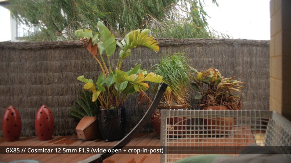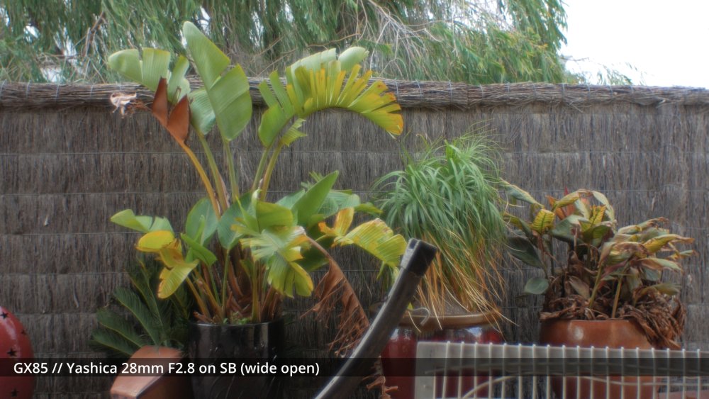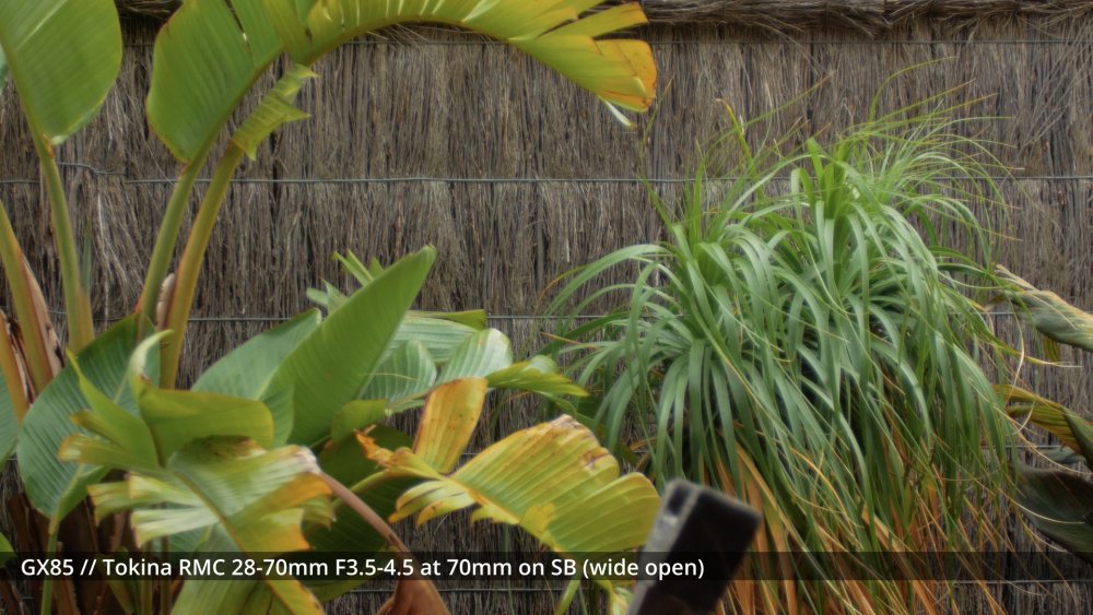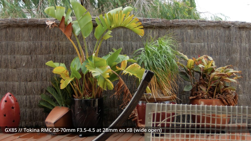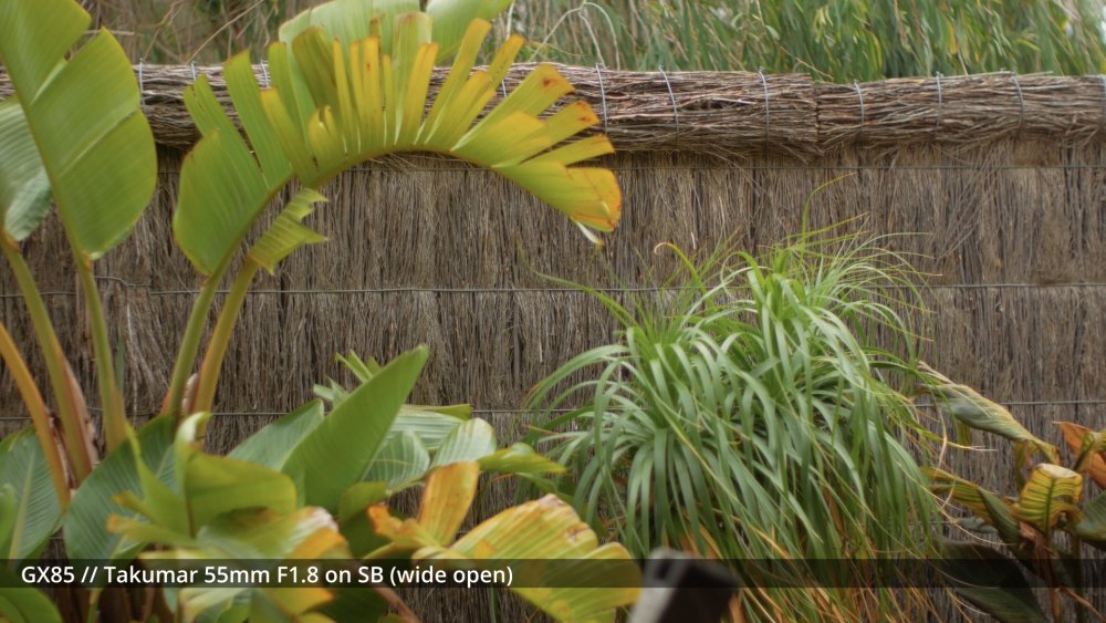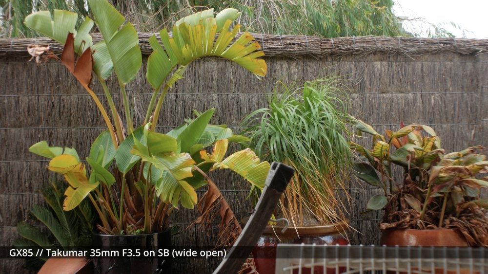 I've sort of been waiting for my adapters to arrive to shoot the next round of tests, but I figured that sharing some early impressions might be useful and help me organise my thoughts a bit too. I shot my first round of the test quite poorly, so images have different exposures etc, which is why I wasn't sharing them before, but there are some interesting things to note from some of the different lenses. The 14mm F2.5 is sharp from edge to edge and has relatively deep DoF, so this is a reference. The Takumar 35mm F3.5 is sharp in the middle and still relatively deep DoF but has significant "zoom" radial blur on the edges. ..as does the Cosmicar 12.5mm F1.9.. The TTartisans 17mm F1.4 has a lot of blooming when wide open (but is clean from F2 onwards) and the Yashica 28mm F2.8 has a lot of blooming when wide open too, although the blooming seems to be a lot larger (with the light from brighter areas being distributed a lot further away in the image than with the 17/1.4) The blur on the edges of the Yashica also seems to have a lot of colour separation too: unlike the TTartisans: or Cosmicar: The Mir-1b 37mm F2.8 is all over the place, reminding me that I have never liked it and never saw what others saw in it: The Helios is about as you'd expect - sharp in the middle but edges that are hype-worthy despite essentially being a one-trick pony: (Note that this is the Helios 44M, not the 44-2. I have the 44-2 and it's easily one of the worst lenses I own, with blooming far in excess of anything I included in this test. It sits in a drawer and stays there.) In contrast to the Helios, the Takumar 55mm F1.8 is much cleaner (bearing in mind this is a shallow DoF image and I'm standing at an angle compared to the fence so the edge softness is likely to be partly the shallow DoF) : The Voigt 42.5mm F0.95 is softer in the middle but has cleaner edges: and the TTartisans 50mm F1.2 doesn't have the blooming of the Voigt, but might not be sharper as bloom and sharpness are independent attributes: but the 12-35mm F2.8 makes all of these look positively vintage: Obviously the other lenses can be stopped down to potentially be as sharp as this is, but I shot all these wide open to learn more about aesthetics, not to perform a technical test, because that's what MTF charts are for. I'd like to say that I can draw some conclusions from this test but realistically it's too early. I do have some impressions though. I suspect I don't like the lenses that have too much bloom. I bought a Tiffen Black Promist 1/8 and shot with it on the 12-35mm and ended up not liking the images in post, and some of these lenses are a lot more bloom-y than the BPM. The purpose of using any lenses other than my AF set (9/1.7 and 14/2.5 and 12-35/2.8 and 14-140/3.5-5.6) is to get shallow DoF or DoF-related things (e.g. oval bokeh from anamorphics) which are essentially the only things you can't apply in post. I have thought before that I don't really like colour separation, like the red halation from film or CA, but the example shots from Attack on London and also from the wide angle adapter don't seem that objectionable, so maybe I'm changing my mind about this? One thing that came out of this test was how much I like the Tokina 28-70mm F3.5-4.5 zoom. It has a vintage flavour for sure, but doesn't seem to be too degraded. I am really looking forward to testing the wide angle adapter and 1.25x anamorphic adapter on this lens, as I suspect those adapters will be limited to around F2.8 anyway, so trading off the flexibility of a zoom for only one extra stop doesn't seem that worthwhile in that configuration. The only lens not yet mentioned is the 14-42mm F3.5-5.6 kit zoom, which in this situation isn't that different from the 12-35mm F2.8. The next test I'll shoot will have significant depth of field, so I can see things like bokeh shapes and rendering (e.g. swirly vs cats-eyes vs not), and I'll have to work out some way to expose all the images the same (or use the GH7 and correct in post) as exposure makes a difference perceptually. I just wish my adapters would get here sooner!