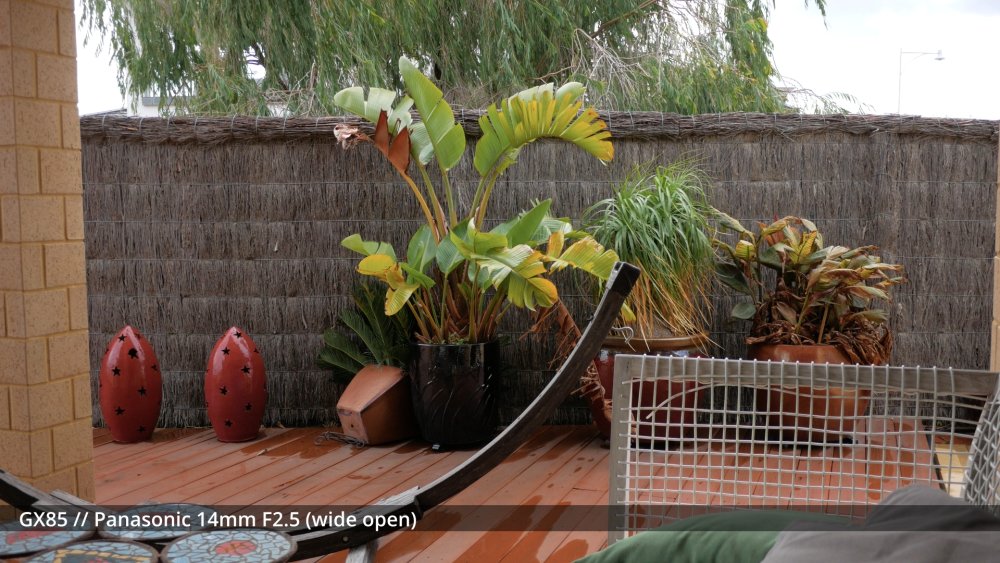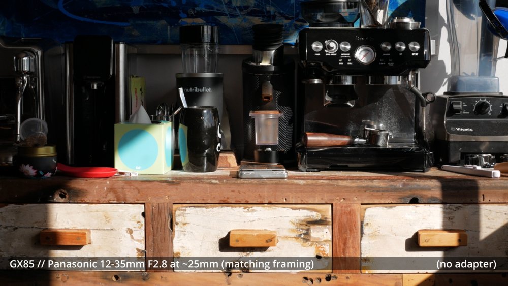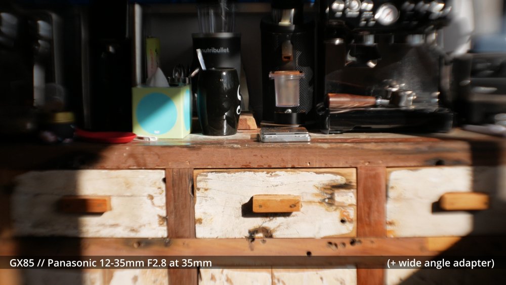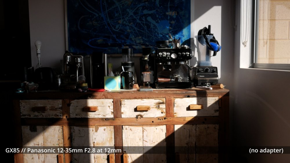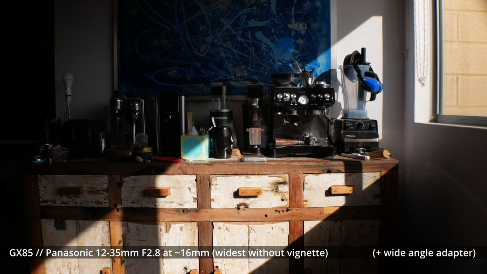 Speaking of serious image degradation, here are a couple of test shots of the 58mm wide angle adapter I ordered. It seems to vignette quite a bit on the wide end of the GX85 + 12-35mm combo, so you don't get a wider FOV by the time you zoom in to eliminate the vignette: The fact it's so much more degraded at 35mm than 16mm makes me think that the adapter is interacting with the optics inside the zoom. If there wasn't an interaction then when it's at 35mm it should be less degraded because it would essentially just be taking a smaller centre-crop and the edges of the frame should be cleaner. Anyway, this level of distortion isn't what I'm chasing, but it might be very different on other lenses and it's still quite fun to play around with.