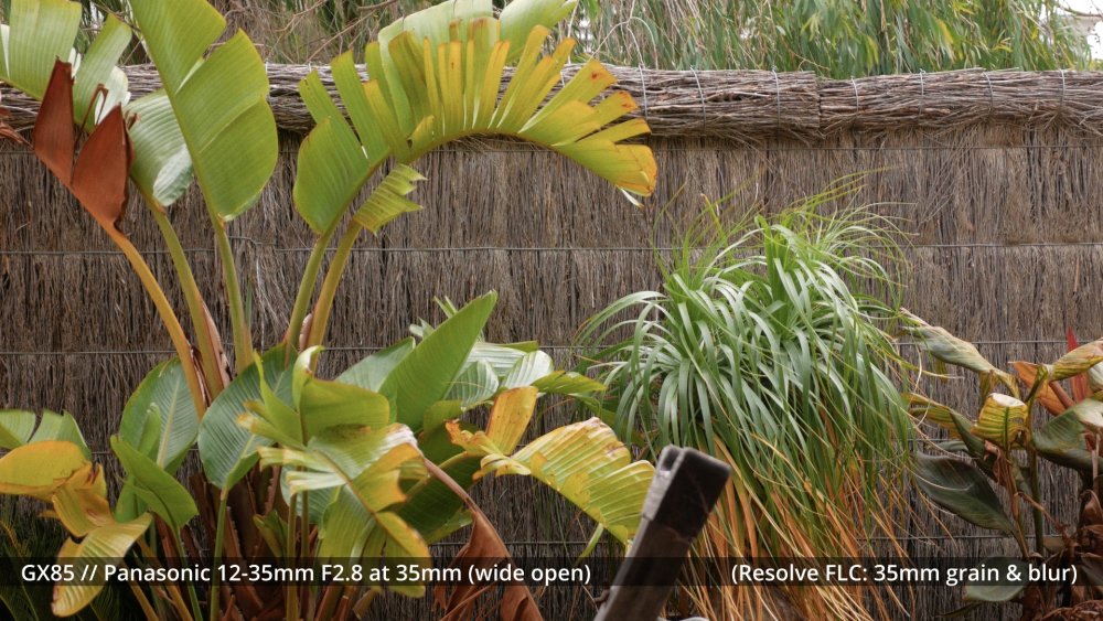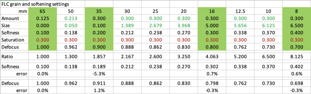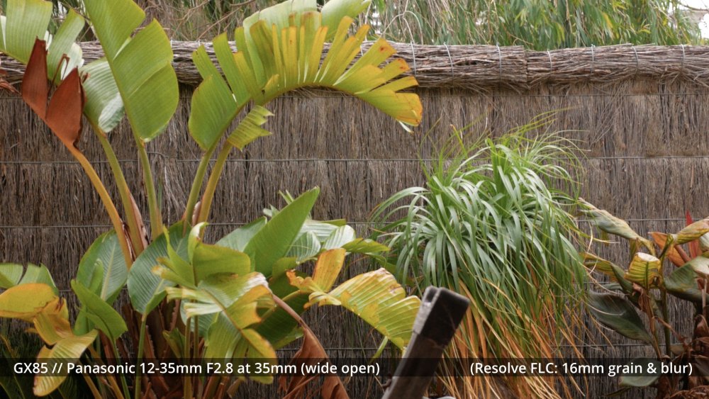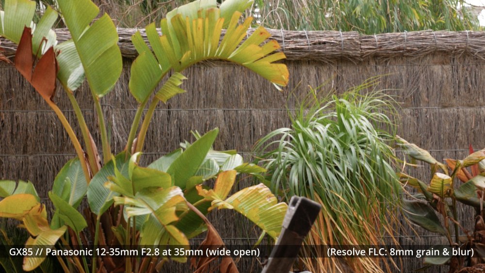 Next test is a big one - comparing a few different ways to soften the image in post. Test shots I shot a number of compositions with a few different lenses. To give a range of inputs, I shot with the following settings: - GH7 shooting 5.7K Prores HQ (1500Mbps) - Panasonic 12-35mm F2.8 at F2.8 and at F4.0 (it sharpens up a little) - Voigtländer 42.5mm F0.95 at F2.8 - Minolta Rokkor 135mm F2.8 at F2.8, F5.6 and F8.0 Shots included wides, mids, teles and had shots where it was overcast and shots in direct sun (including raindrops on things!) so there should be a range of scenes. All shots were 180 shutter and using the K&F True Colour vND. Treatment in post I then put each shot onto a timeline, and you get to see each of the above shots put through each of the following: - 5.7K shots directly on a 4K timeline - Exported from 4K timeline to 4K Prores HQ then pulled back into the main 4K timeline - Exported from 4K timeline to 3K Prores HQ then pulled back into the main 4K timeline - Exported from 4K timeline to 2.5K Prores HQ then pulled back into the main 4K timeline - Exported from 4K timeline to 1.9K (1080p) Prores HQ then pulled back into the main 4K timeline - Exported from 4K timeline to 1.5K Prores HQ then pulled back into the main 4K timeline - Exported from 4K timeline to 1.2K (720p) Prores HQ then pulled back into the main 4K timeline - 5.7K shots directly on a 4K timeline with Film Look Creator emulating the grain and softness of a 65mm neg - 5.7K shots directly on a 4K timeline with Film Look Creator emulating the grain and softness of a 50mm neg - 5.7K shots directly on a 4K timeline with Film Look Creator emulating the grain and softness of a 35mm neg - 5.7K shots directly on a 4K timeline with Film Look Creator emulating the grain and softness of a 30mm neg - 5.7K shots directly on a 4K timeline with Film Look Creator emulating the grain and softness of a 25mm neg - 5.7K shots directly on a 4K timeline with Film Look Creator emulating the grain and softness of a 20mm neg - 5.7K shots directly on a 4K timeline with Film Look Creator emulating the grain and softness of a 16mm neg - 5.7K shots directly on a 4K timeline with Film Look Creator emulating the grain and softness of a 12.5mm neg - 5.7K shots directly on a 4K timeline with Film Look Creator emulating the grain and softness of a 10mm neg - 5.7K shots directly on a 4K timeline with Film Look Creator emulating the grain and softness of a 8mm neg Yes, this is a lot of shots! Each shot on the timeline is 5s, and there are 8 shots across 17 treatments, giving 136 looks over 11m21s video. All shots had the FLC "Cinematic" look applied, and I adjusted the WB and that was it. I disabled all the other stuff, so it was just the colour profile and the grain / softening. Export I then exported it in both 4K Prores HQ (56GB!) and 4K h264 (3.65GB) and after comparing the two I uploaded the 3.65GB h264 file, which is about 45Mbps so good enough. There were slight differences between the two but it was minor and I tend to export in h264 for YT upload anyway. I will be downloading the resulting file from YT and judging the image from that file, as that's the one that gets viewed in the end. Film Look Creator settings The FLC Grain section has various settings, and has presets for 65mm, 35mm, 16mm, and 8mm, but allows you to mess with the settings. To emulate sizes in-between these presets, I interpolated the values using either a linear or logarithmic approach. Here's the values: Goal My goal is twofold. First is to work out what looks the most like cinema to me (in the final YT stream), and the second is to know what settings to use in Resolve to get that look in the final YT stream. If I could play with the controls live and see what the YT stream would look like in real-time then I'd just do that, but this is the next-best option, where I just vary something from too little to far too much and then just see if I like it and if so then where the sweet spot is. Enjoy.