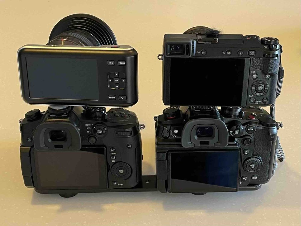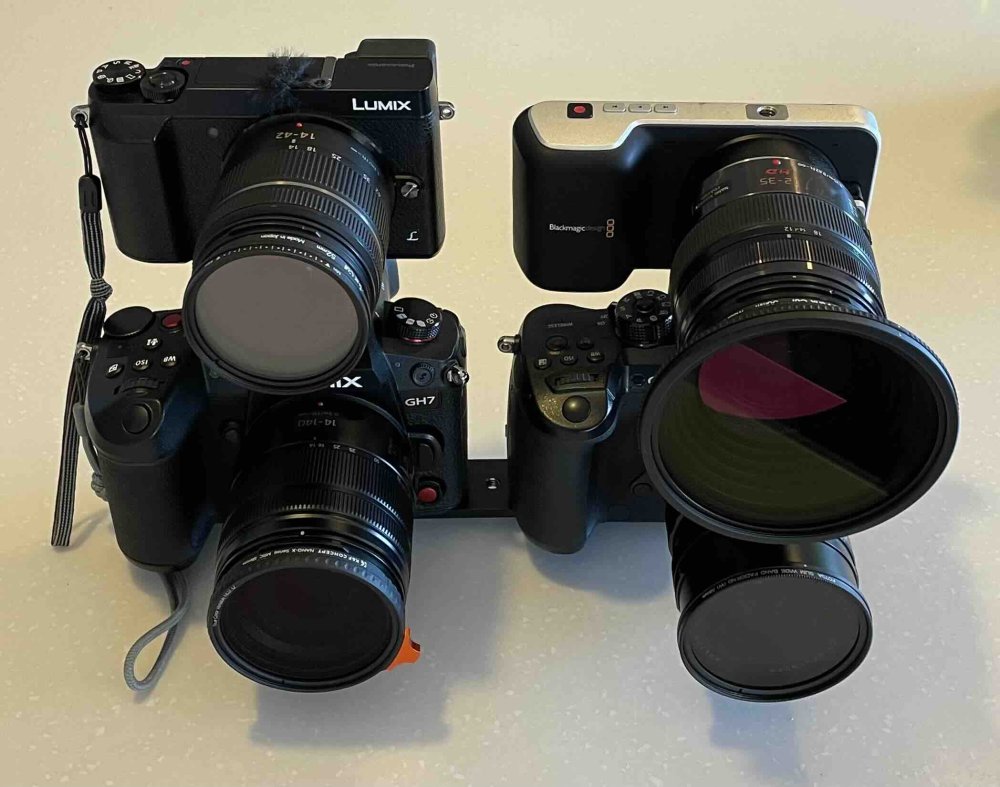 Wow, "too clean" wasn't a reaction I anticipated!! Yes, it was 24p (well, 23.976p anyway). I don't think I've heard of shooting a little slower to give a more filmic cadence - interesting idea and one I will absolutely try. I'm not sure how I would actually shoot at that speed, as I don't know which of my cameras would offer that option, but as a test I could just slow some of the above 24p plant footage down as plants moving slightly slower in the wind is a thing that happens so shouldn't be too surreal. I've slowed 30p cameras down to 24p, which is a 20% speed reduction and noticeable, which would be about the same for slowing 24p down to 20p. I am yet to really study that test I posted, but my initial impressions were that while it looked like film, it didn't have that certain something I'm looking for. What I'm looking for I can't describe, but it's sort-of the opposite of that "video look" of shooting 60p with sharp lenses and with accurate colour science and proper WB. I watched Old Guard 2 a few days ago and was impressed with how it seemed to have a cinema look but was also quite sharp (which I think have a strong negative relationship) but when I went back and took screenshots I found it actually wasn't that sharp. I then went looking at film trailers trying to find examples with this real cinema look, but most of them were sort-of "neutral" in the sense that they looked somewhere between cinema and video, with some being closer to cinema than others but none being fully at that end of the spectrum. They were mostly uploaded in 1080p from the studios, and the ones in 4K were from other movie review sites and looked a lot more detailed but I can't be sure if these are AI upscaled or what the image pipeline was, so I didn't look at them. When I think about what looked really cinematic to me is mostly old films that were actually shot on film and are surprisingly soft and grainy, so I really need to go looking for some high-quality footage (that I can trust) from more recent films. Anyway, this all sort of made me question if I was now just seeing things, or if all the trailers looked too sharp to me (including the trailer for the first Knives Out movie which seemed to be very high quality upload), so I am going to do some more testing and try and reality check myself with more research and more testing. Also here in Australia some services stream in SD (for a variety of reasons) so there's a non-zero chance I've just gotten used to that, but having said that when I go to the cinema to watch the really big films (like Dune 2 or Bond movies etc) they don't look sharper than I was anticipating, so I don't think it's that. In an attempt to give myself some perspective, yesterday I shot a motion test where I shot the same shot of the plants and then I walked through the backyard, with the following settings: - iPhone 60p using auto-SS (short shutter) - iPhone 30p using auto-SS (short shutter) - iPhone 24p using auto-SS (short shutter) - GX85 24p using auto-SS (short shutter) - GX85 24p using 180-degree shutter - GH7 24p using 180-degree shutter - GH7 24p using 216-degree shutter - GH7 24p using 288-degree shutter - GH7 24p using 360-degree shutter - GH7 24p using 108-degree shutter - GH7 24p using 70-degree shutter I haven't looked at that one in detail yet either, but it was sort of a combined test of subtle variations in shutter speeds (the GH7 shots) and also a reality check to judge the GH7 shots against actual video (iPhone and GX85 auto-SS shots). Today, I've just finished assembling this monstrosity: This is the P2K and GX85 on top, with GH5 and GH7 on the bottom. I finally own enough vNDs to do this, although the 82mm vND I bought for the Sirui anamorphic adapter does look rather ridiculous on the P2K and 12-35mm! I'll shoot a side-by-side with all of them rolling and will walk around the yard to get a number of compositions and lots of movement. I forgot to include the P2K in yesterdays test, but I also want to have a reference where the motion is essentially the same, which is why I have rigged them together. I can replicate a 35mm F11.5 FOV on all these, so should have mostly the same image. There will be resolution/sharpness differences, but I can level the playing field in post by applying various FLC profiles, which will be a good test to see if any perceived differences disappear or not. I'm still waiting for my Sirui 1.25x anamorphic adapter to arrive, but once it does some future tests will include various combinations of the wide-angle adapters, the anamorphic adapter, modern AF lenses, modern MF lenses, vintage lenses, and probably some filters too, as I've got a small collection of softening filters and a few vNDs of vastly varying quality which should add a look to the footage too. I might also shoot some tests comparing various amounts of rolling shutter too, as I think the GH7 has strong enough codecs and enough modes to make meaningful comparisons between these too.