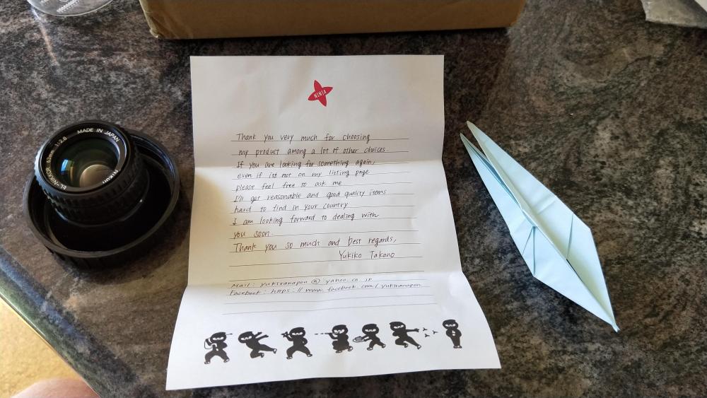 well the el nikor 63 turned up in pretty good time from japan. have to say i like dealing with the japanese. not that i dont like you americans, but your postal service wants to violate me fiscally ? the lens looks immaculate, got a hand written note and a piece of origami no idea how it works or what it does but its the thought that counts ? have ordered a m39 to m42 step up ring and 40.5 to 55mm ring for the front as per tito's review. stay tuned but would it attract a crowd of birds, or are they likely to mistake it for some type of punt gun ?