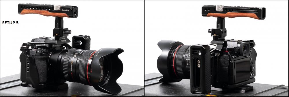 I now have my Panasonic S5 rigged to meet every type of project that I shoot and I know how much time it can take to get your gear rigged up in a way that works for you so I figured I'd share my setup in case someone else is looking for ideas. Every rig is kept as simple as possible, I can go from one rig to another within less than a minute and none of the rigs require tools to put together or take apart. Also, all of my handles, lenses, rails, tripod plates, audio equipment, and even the V Mount battery is interchangeable with my Canon C200 which is what I wanted for simplicity. For each set up I provide a parts list and what I use that setup for. All Setups - Parts SmallRig Cage for Panasonic S5 Camera 2983 SMALLRIG Quick Release NATO Rail 1.6 Sigma MC-21 EF-Mount to L-Mount Adapter Andoer Rapid Connect Adapter with Quick Release Sliding Plate Setup 1 - This is my setup for when I am shooting video only and have the talent wired for audio via a wireless lav mic or a wireless microphone. The extra weight makes handholding easy and I can rest the back on my shoulder or chest for short interview type work. I also shoot content for some YouTube influencer's channels and this setup lets me shoot hand held while capturing their lav audio. With this setup I think I can shoot for about 10hrs without running out of battery life Equipment Canon EF 24mm-105mm F4 Panasonic DMW-XLR1 XLR Adapter Sennheiser G4 receiver Sennheiser to XLR cable SMALLRIG Aluminum Side Handle with NATO Clamp SMALLRIG Tripod Mounting Kit with 2x plates and 2x 15mm Rod Clamps SMALLRIG 16 Inch Rods x 2 Bebob Factory GmbH COCO-15V III V Mount Battery Plate V150 Bebob Battery USB A to USB C cable 2 x Andoer Rapid Connect Adapters Setup 2 - Same equipment as setup 1 but with the addition of a Manfrotto Video Tripod which also has an Andoer Rapid Connect Receiver plate mounted on it. In the picture I show how I can slide the S5 off of the rails and slide the C200 onto the rails within seconds. Setup 3 - This is my long form event setup. If I just need a static camera and natural audio this would be my setup. Although I show an external monitor here, I don't actually use one but I showed it anyway in case someone wanted to see where a monitor could go. Equipment SMALLRIG HTN2362 Rotating NATO Clamp Handle SMALLRIG Aluminum Side Handle with NATO Clamp SMALLRIG Tripod Mounting Kit with 2x plates and 2x 15mm Rod Clamps SMALLRIG 16 Inch Rods x 2 Bebob Factory GmbH COCO-15V III V Mount Battery Plate V150 Bebob Battery USB A to USB C cable 2 x Andoer Rapid Connect Adapters Video Tripod Setup 4 - Same equipment as Setup 3 but without the tripod. This is my handheld setup when I am shooting video only and do not need high quality XLR audio. Setup 5 - This is my handheld hybrid shoot setup when everything gets crazy and I am shooting a mixture of video and photos and will not use the onset audio at all. Equipment SMALLRIG HTN2362 Rotating NATO Clamp Handle SMALLRIG Aluminum Side Handle with NATO Clamp Setup 6 - Same setup as 5 but on a monopod. I use the top handle for additional stability and additional points of contact. I also can use the monopod as a light glidecam if I need a little forward or backward movement. Setup 7 - This is my gimbal setup for everything from real estate to music videos. Equipment Canon EF 24mm F2.8 Ronin S with Inverted Handle Sling Grip