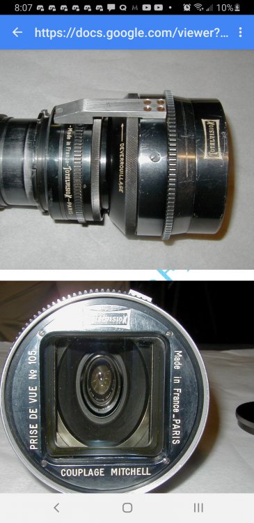 Wow, exactly the kind of interesting info I was hoping someone would have. Fascinating! So it is indeed not an on-camera adapter as I thought...awesome. I know the totalscope/totalvision/franscope adapter of similar design was often used with the early angenieux zoom, the 35-140mm (i think), using either a solid piece linking between the two focus rings so they focus together, or a "cam" or gear setup that focused both lenses together. Any idea what the typical setup with this thing would've been in terms of taking lens and focus? Thanks for your insight!