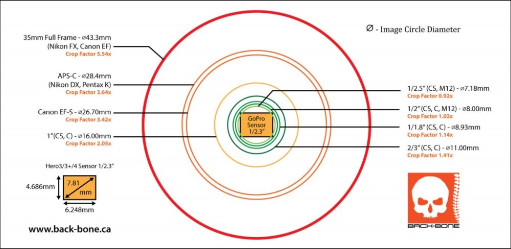 i looked at the conversion some time ago for a gopro, however the 5x crop for the 35mm wasn't what i was after and i wasn't interested in starting a cs mount collection. The following is taken from the backbone sight What Lens Should I Buy? That’s probably the most common question we get asked and it depends on what you are looking to do with the camera. For reference the standard GoPro lens is 2.8mm, so 3-12mm are good for wide/medium shots. 16mm – 25mm are great for closeups with soft backgrounds and longer lenses are great for zoom and telephoto. Before getting into details, first let’s look at the different lens types that the Ribcage supports without the need for an adapter. M12 Also known as ‘S-Mount’ or ‘Board lenses’. They are lenses similar in size to the original GoPro lens. Typically these are best used for applications requiring small size and weight such as use with small drones and gimbals. This lens type typically has a fixed focus and fixed iris so they are meant to be set up once and locked in. CS-Mount These attach to the large mounting ring on the camera. CS-Mount was developed mostly for security applications so there are thousands of ultra sharp high megapixel lenses available at a relatively low cost. This lens type also commonly has ‘IR-Corrected’ or ‘Day&Night’ capability. That means they can focus on Infrared and visible light at the same time which a normal lens can’t. C-Mount C-Mount was originally developed in the 1920’s for film cameras and has been in use ever since. These can be attached to the camera by attaching the 5mm spacer ring. There are a vast array of C-Mounts available as they were commonly used on home movie cameras in the 50’s and 60’s, security and TV cameras and now for machine vision, factory automation and inspection applications that require the highest quality optics. You can buy vintage or new! While you can connect any M12, CS or C-Mount lens, 1/2.3″, 1/2” and 2/3” lenses are best. The value in inches simply tells you the size of the image sensor the lens was originally designed for. The GoPro uses a 1/2.3″ sensor. Ribcage has a crop factor of 5.6x for 35mm SLR lenses, so wide angle lenses are generally more useful. 1/2.3”, 1/2”, 1/1.8” and 2/3” M12, CS-Mount and C-Mount lenses are ideal. 1/2.5” lenses are ‘technically’ slightly too small for the sensor but in most cases give complete coverage and excellent results. 1/3” or 1/4” lenses are too small for the sensor to be used in wide mode, although they can still be used with the camera’s ‘medium’ and ‘narrow’ shooting modes. Auto iris lenses are not recommended as they require an external power supply in most cases. Focal lengths ranging from 4mm up to 25mm will prove to be most useful for general shooting. Focal lengths under 4mm will have a similar or more pronounced fish-eye effect than the stock GoPro lens unless they are labelled ‘rectilinear’ or ‘low distortion’. We’ve found it best to use lenses labelled ‘HR’ or ‘Megapixel’ for HD shooting. 3MP, 5MP and 10MP lenses should produce outstanding results. If you want to use the optional night vision feature of the Ribcage, IR corrected or D&N (day & night) lenses are recommended. These lens types allow IR and visible light to be in focus at the same time. Only lenses with manual features are supported. The GoPro is not capable of controlling fully automatic lenses. The built in M12 socket of the Ribcage will support M12 lenses with a maximum of 4.65mm back focus distance. At maximum distance the set screw may not engage. For M12 lenses requiring a longer back focal distance we offer an optional M12 to CS-Mount adapter which provides all the necessary distance required. Brands we have tested and find to be generally quite good are Computar, Kowa, Tokina, Fujinon, and Tamron. A selection of recommended lenses can be found in our shop. Visit http://www.digified.net/focallength/ for a magnification calculator. Choose the “Digital Compact with 1/2.3” Sensor” option. You can then punch in different focal lengths to see their 35mm equivalent. This is a great tool for deciding what focal length will best suit your needs. Below is a crop factor diagram showing the image circles projected by the most common lens types in relation to the GoPro image sensor. You may find it helpful to visualize the crop factor. Click to enlarge. Crop Factor Chart GoPro Shooting Modes This image shows the sensor area used by GoPro’s different shooting modes. Medium mode gives you 75% field of view and Narrow mode will give you 50% field of view relative to the full sensor. These modes can be quite handy if you are using a lens smaller than the recommended 1/2.3″. You can also get more magnification from a wide angle lens if you need to.