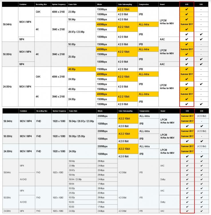 Claes Lind Posted January 10, 2017 Share Posted January 10, 2017 20 minutes ago, Stanley said: 24.00HZ, MOV/MP4,4096x2160,48P,400Mbps,422 10 Bit,All- Intra, Summer 2017.... Follow The Yellow grid. Well spotted Simon. I'm still hesitant. I'm reading 48p the same way as 50p and 59.94p is listed above it, with the chart indicating 150mbps. If you look at the top where you have 23.98 it's listing two bitrates. And then 3 bitrate options for all regular framerates. If 48p was possible in 400mbps wouldn't that be listed under 150mbps? Let's see if Andrew can comment and clear it up if it's been confirmed from Panasonic Link to comment Share on other sites More sharing options...