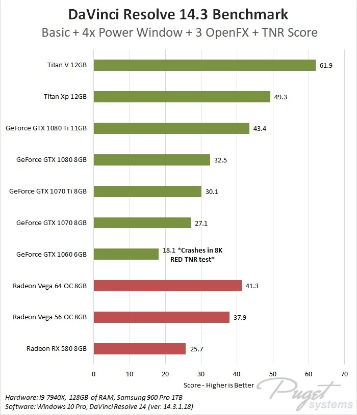 A_Urquhart Posted July 2, 2019 Share Posted July 2, 2019 On 7/2/2019 at 1:23 AM, webrunner5 said: What is wrong with gaming benchmarks? They use the Fastest CPU, Fastest GPU, and the Fastest Memory. So for editing you are going to use the slowest of all of that? You can go on BMD website and see what they recommend and it is perfectly suited for gaming. A fast, powerful computer is a fast, powerful computer no matter what you use it for. Image 1. As you can see below, the RX580 does not rate as highly as a comparatively priced GTX1060 on the comparisons you linked to. Also note how much lower a score the RX580 got compared to the 1070. Image 2. But, in Davinci Resolve below, for many tasks, the RX580 outperforms the GTX1060 by 20% and is actually closer in performance to the GTX1070 despite it rating way below the 1070 on your gaming benchmark. Link to comment Share on other sites More sharing options...