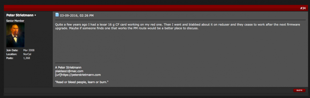 IronFilm Posted July 7, 2019 Share Posted July 7, 2019 On 7/7/2019 at 12:51 AM, BTM_Pix said: As far as I remember, the 8 gig Lexar 300x CF card is compatible so can be picked up off eBay in multiples to kind of mitigate it. Only one very specific model, and an 8gig card.... is bad enough using 16gig cards with the R1! On 7/7/2019 at 12:51 AM, BTM_Pix said: One way round it is to get one with the SSD Side Module As my previous post was saying: They're rare. And thus have a high inflated cost. (for something that is so very old!) Life would be easy for any prospective/current owner/user of RED ONEs if RED simply allowed any CF card to be used in their discontinued RED ONE. What cost would there be to RED?? (other than a bit of programming time) NONE! Am sure this would not be stealing away any sales from their current line up of RED cameras. And in return it would bring a lot of good will and renewed faith in the company. Plus bring in more young / new / aspiring / emerging filmmakers to join the RED ecosystem with their "new" RED ONE, who will one day move on up and buy RED's latest cameras. On 7/7/2019 at 12:51 AM, BTM_Pix said: By the way, someone had some joy with a 16gig version of a Lexar car and, well, here is his story on Reduser about what happened when he tried to share the love ! I'm not surprised!! Didn't RED do that to the 8gig Lexar cards as well? 23 hours ago, thephoenix said: could be a 5' video if the guy would stop repeating the same quote 10 times Yes, the video was longer than it absolutely needed to be, but I feel the way he did made the video much more entertaining! I think it was great. Wouldn't change it. 22 hours ago, BTM_Pix said: He doesn't deserve it? RED have accused him of all sorts in a court case that had been running for nearly 3 years that has now been dismissed. A company owned by a multi-billionaire trying to bully a tiny operation out of business based on absolutely bogus claims and he's had to keep his mouth shut about it? I think he deserves to be able to make it into a 5 part mini-series after all that. Not to mention be bought a drink by everyone who will benefit from what he has laid out there. Heck, he can make it into a twelve episode show that runs for five season if he wishes! I'm sure there is enough drama and intrigue there to fill it up. Emanuel 1 Link to comment Share on other sites More sharing options...