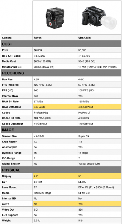 Jonesy Jones Posted September 28, 2015 Author Share Posted September 28, 2015 RED Raven or URSA Mini 4.6K? Which to go for if their body price is the same & you could pick either? (which they're not! URSA Mini is clearly going to be many thousands cheaper to own)Clearly the URSA Mini comes out the winner here, as I don't think the Raven is better specced. URSA Mini is:a) has 4K ProRes (Raven doesn't)b) has XLR inputs c) better ergonomicsd) global shutter optione) sensor size which is a better match for the Canon EF mount (URSA Mini is a little larger than APS-C vs GH2 sized for the Raven)f) as well as PL/B4 (and more??) mount options available insteadg) cheaper media (and rapidly getting cheaper!! You won't see the same rate of price drops happen with RED's media)h) I half suspect URSA Mini will have the edge over Raven in low light (though not by a huge amount,. a stop or less). I suspect dynamic range to be close too, given how RED overstates theirs. Will have to wait for each to ship however before this can be really clear which way it falls.i) way cheaper EVF (and better too I reckon)j) better slow motion (same fps, but Raven's is heavily compressed RedCode at 13:1 while the BMD URSA Mini can do it in uncompressed raw!)k) better input/output options. l) BMD wins with the higher resolution (ironically so.... as that is RED's big obsession, resolution)m) free copy of the industry standard DaVinci Resolve (which you'll need to purchase if you wish to colour grade Raven's footage with it)n) and last but not least.... URSA Mini will ship earlier!! (yes, even with BMD's record of always being late)Of course the usual caveats apply with this analysis: nobody has either of these in their hands yet, so specs analysis vs real world use might be far apart!Thank you IronFilm for doing this. I have all of that in the PDF that is in the original post. I can't do a screenshot until I get back to my workstation middle of next week. But your summary is very well done. Quick question, did the fps for the URSA mini change? I am only aware that it does 60 fps at 4.6K raw. I think you need to go down to windowed HD prores to get 120, and it was even touted to have 160 at one point. But that would be great if it did 120 full res raw. Link to comment Share on other sites More sharing options...