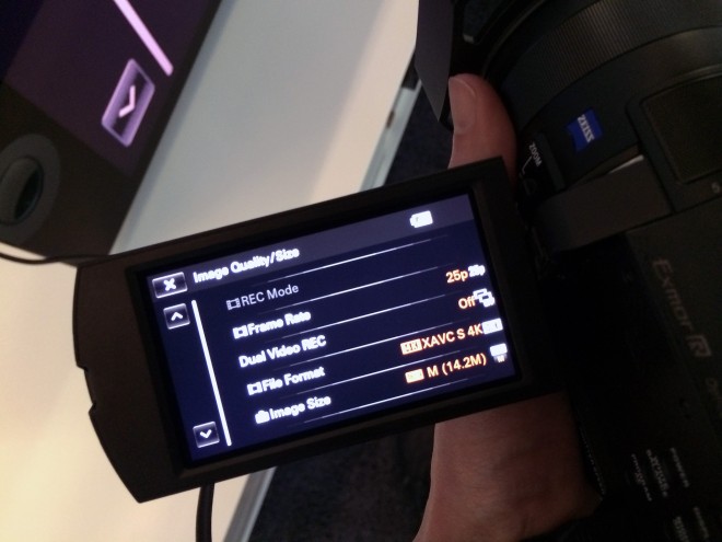 I was unable to tell from the TV if it was a 8bit or 10bit output. Same goes for colour sampling. I expect it is 8bit 4:2:2 like the Sony A7S. This makes the AX100 a whole lot more attractive in terms of potential image quality. Unfortunately mounting the recorder is going to be tricky. There’s only a hotshoe and this is recessed so only Sony’s own accessories attach cleanly. Others will need some kind of third party adapter.