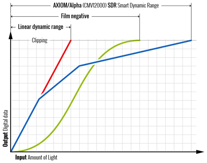 “Imagine your camera had a knob for dynamic range like the one it has for shutter speed. You can turn it up or down just as you need it. Sounds crazy doesn’t it? That’s exactly what this sensor can do. While in general the notion is “the higher the dynamic range the better” you need to be aware that you sacrifice details (digital bandwidth) in shadows/midtones for gains in latitude when you increase dynamic range. This could be undesired in situations like when dealing with fine skin tones or when the scene does not require a high dynamic range at all e.g. when shooting well lit indoor scenes. Smart Dynamic Range for us means that you can dynamically influence the response curve for your particular situation in a range from 10 – 15 stops of dynamic range.”