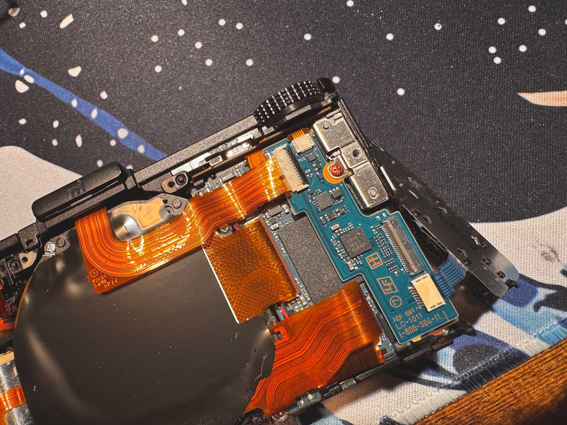 Apparently Sony had so tightly packaged the components to fit the small casing that the flexible printed circuit cables (ribbon cables) were bent at such extreme folds that over time the metal begins to fatigue and crack. One of the most common issues on the RX100 series is that the flexible cable connecting the lens module to the mainboard starts to break apart spontaneously. No amount of careful treatment by the user throughout the life of the camera will stop this from happening. It’s a design spec flaw, a mistake by Sony and a side effect of trying to fit too much into such a small camera.